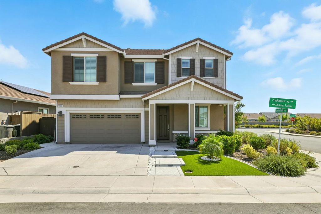 6000 Shimmer Falls is waiting for its next loving owner! This beautifully upgraded corner-lot home is a perfect blend of luxury, functionality, and warmth. Enjoy the benefits of owned solar and appreciate the natural bright light that floods throughout. The heart of the home features a modern kitchen with white quartz countertops, rich brown cabinetry, a spacious island, walk-in pantry, and a cozy coffee bar nook. The open-concept layout allows you to cook while staying connected to your guests or watching TV. Step outside to your professionally landscaped backyard designed for entertaining and relaxation. Over $30,000 in landscaping upgrades include premium turf, stamped concrete and a built-in firepit ideal for evening gatherings. Upstairs, a versatile loft is ready for a media/game room or potential 5th bedroom and you will sink your feet into plush high-quality carpet in every room. The primary suite offers two walk-in closets, dual sinks, a private toilet room, and a relaxing bathtub. Additional highlights include a downstairs bedroom and full bathroom, and a garage with a unique mini kitchen featuring running water and gas stove top (not yet plumbed). With only one neighbor fence and plenty of guest parking, this move-in ready home is waiting for its next chapter!